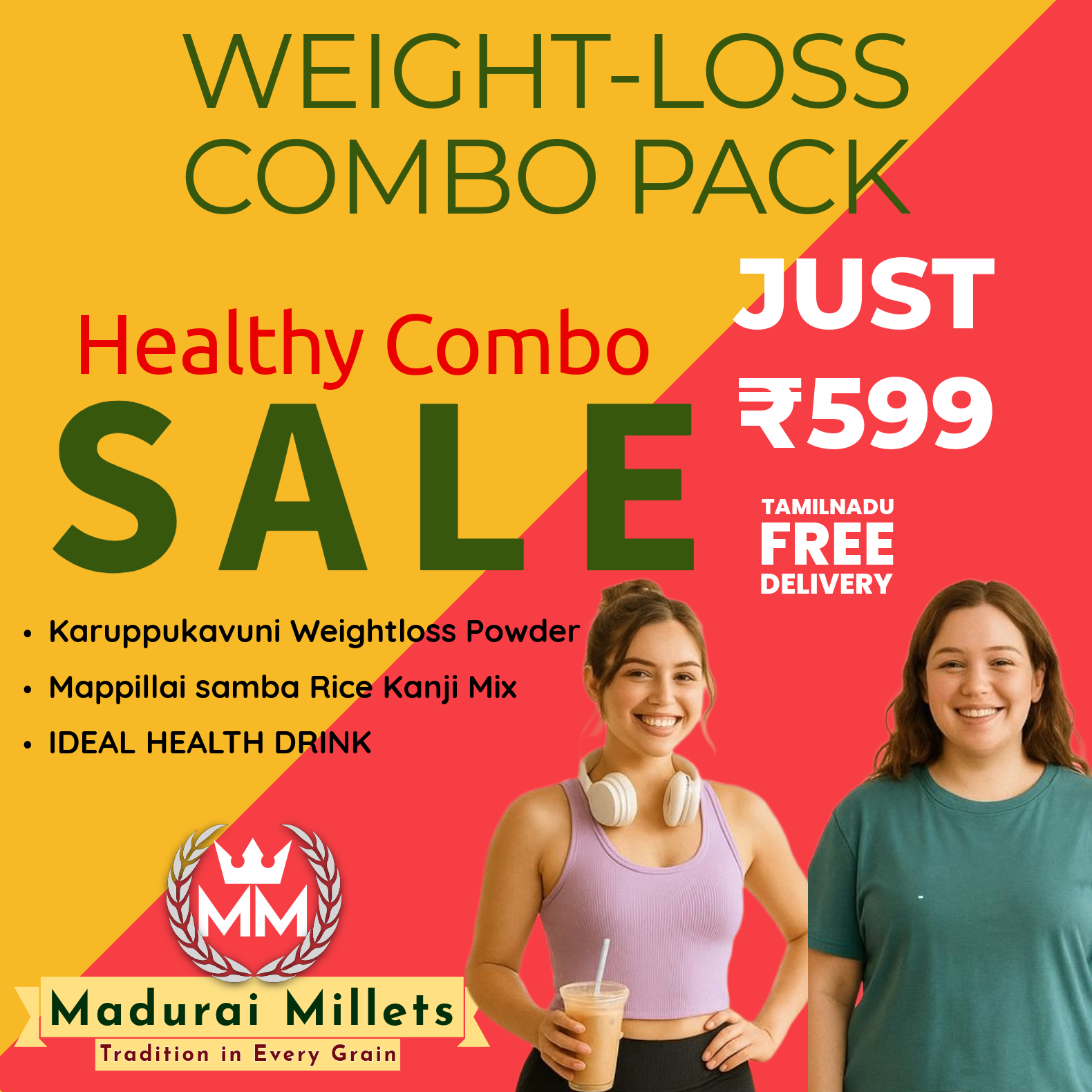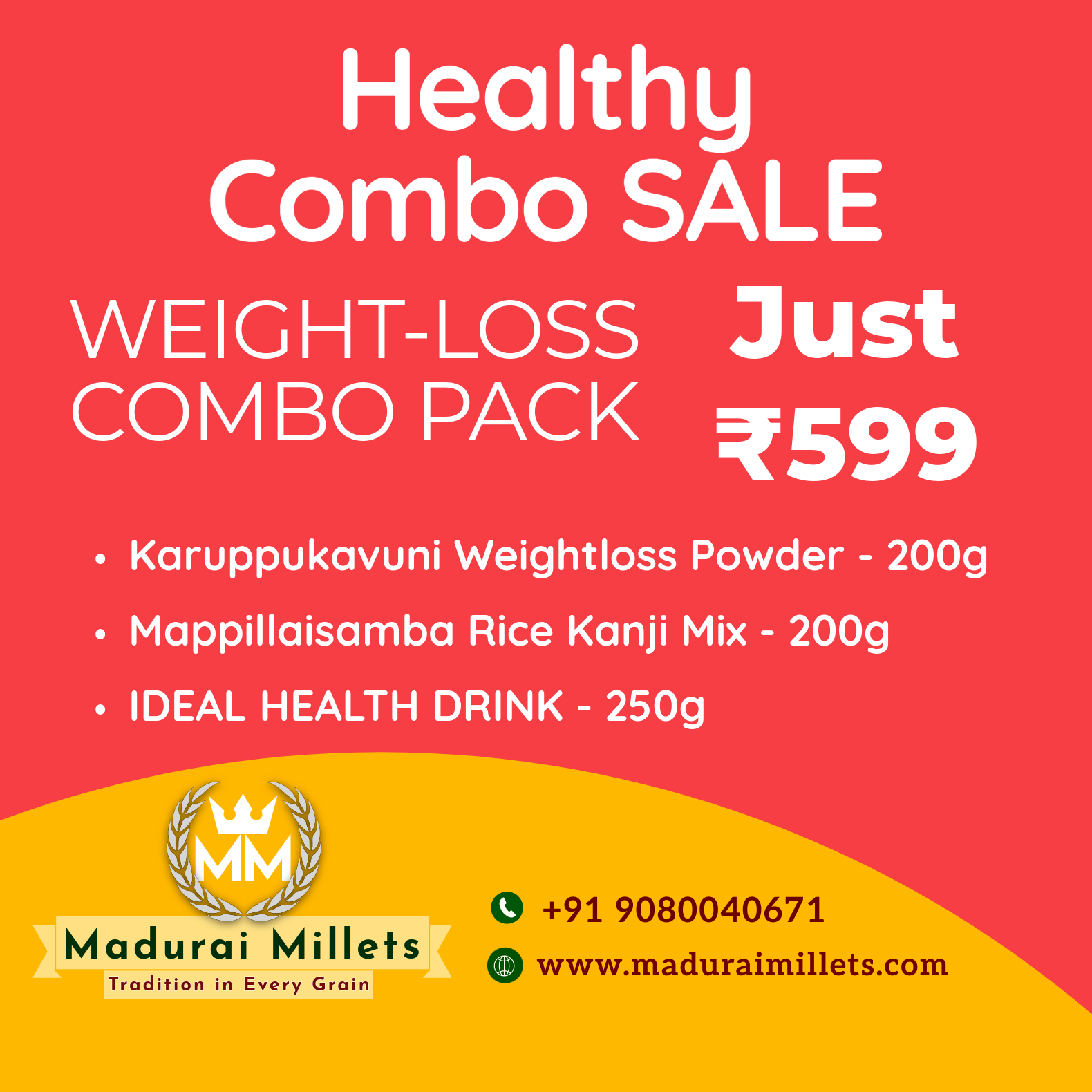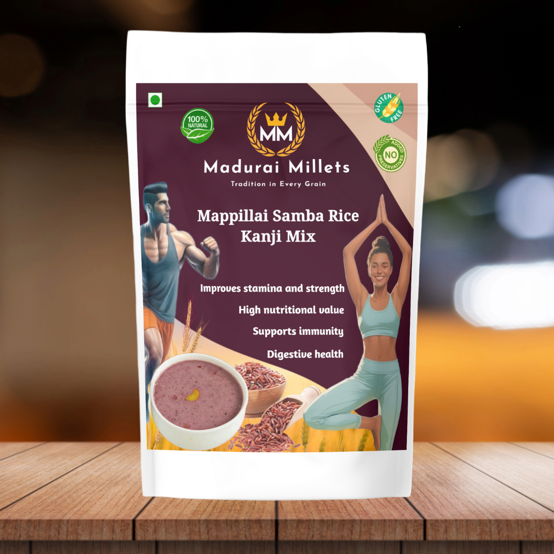 Just ₹599 — a perfect blend of tradition and wellness from maduraimillets. This combo includes the royal Karuppu Kavuni rice, nutritious Mappillai Samba rice, and a refreshing Health Drink to support your fitness goals.